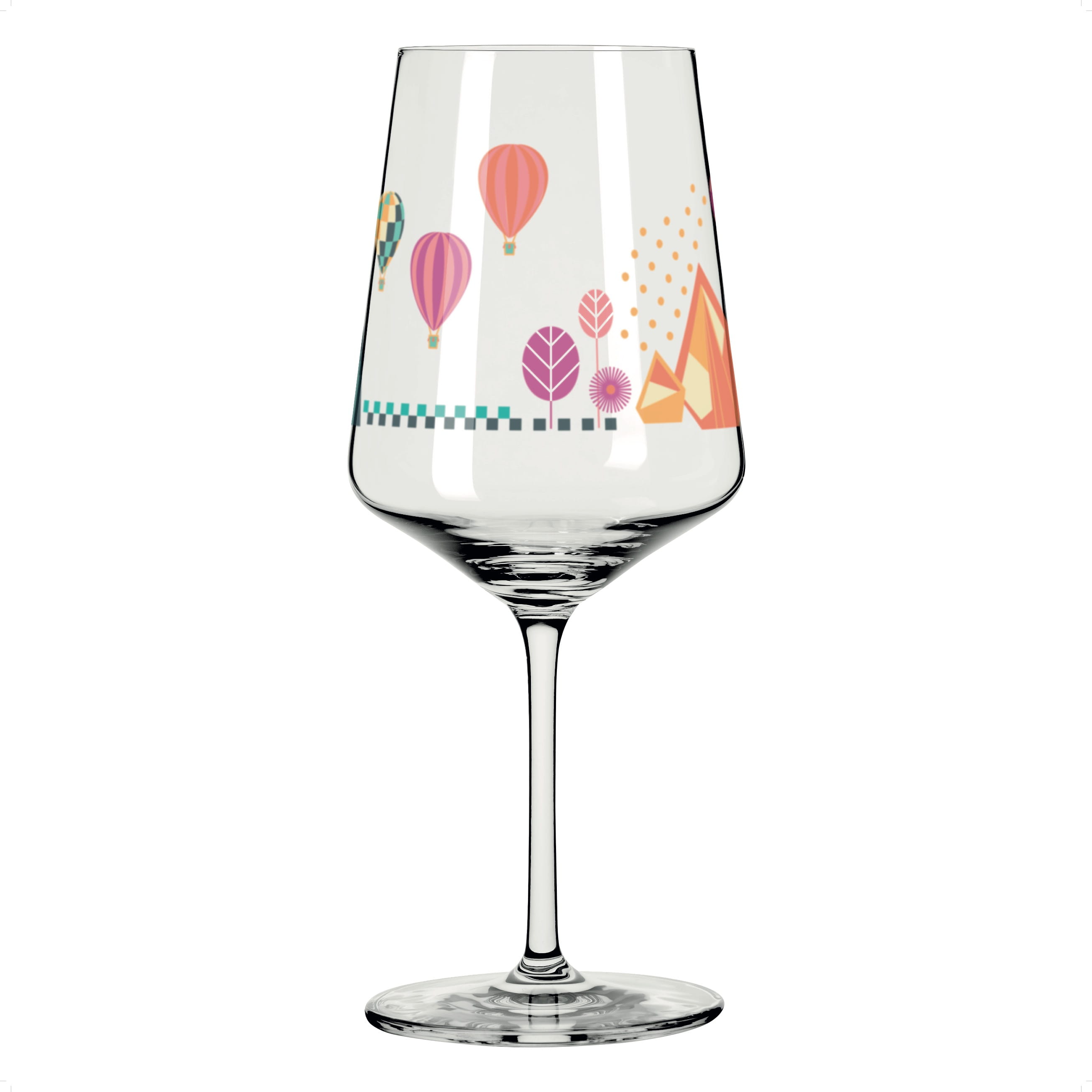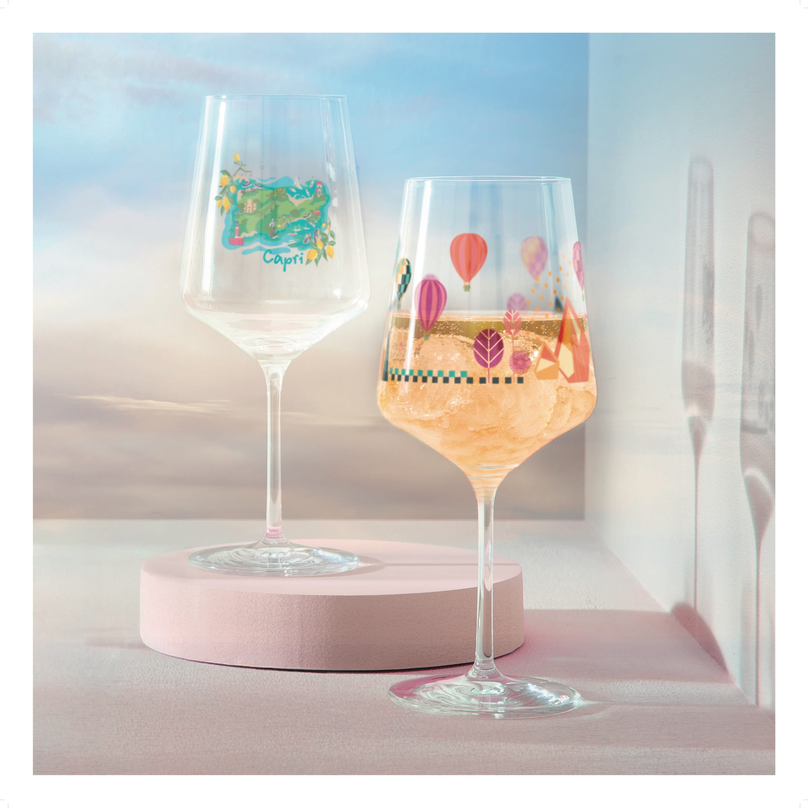 This glass captures the feeling of lightness and freedom – with colorful hot air balloons floating above stylized landscapes. Every sip becomes a little flight of fancy full of color, imagination, and zest for life.