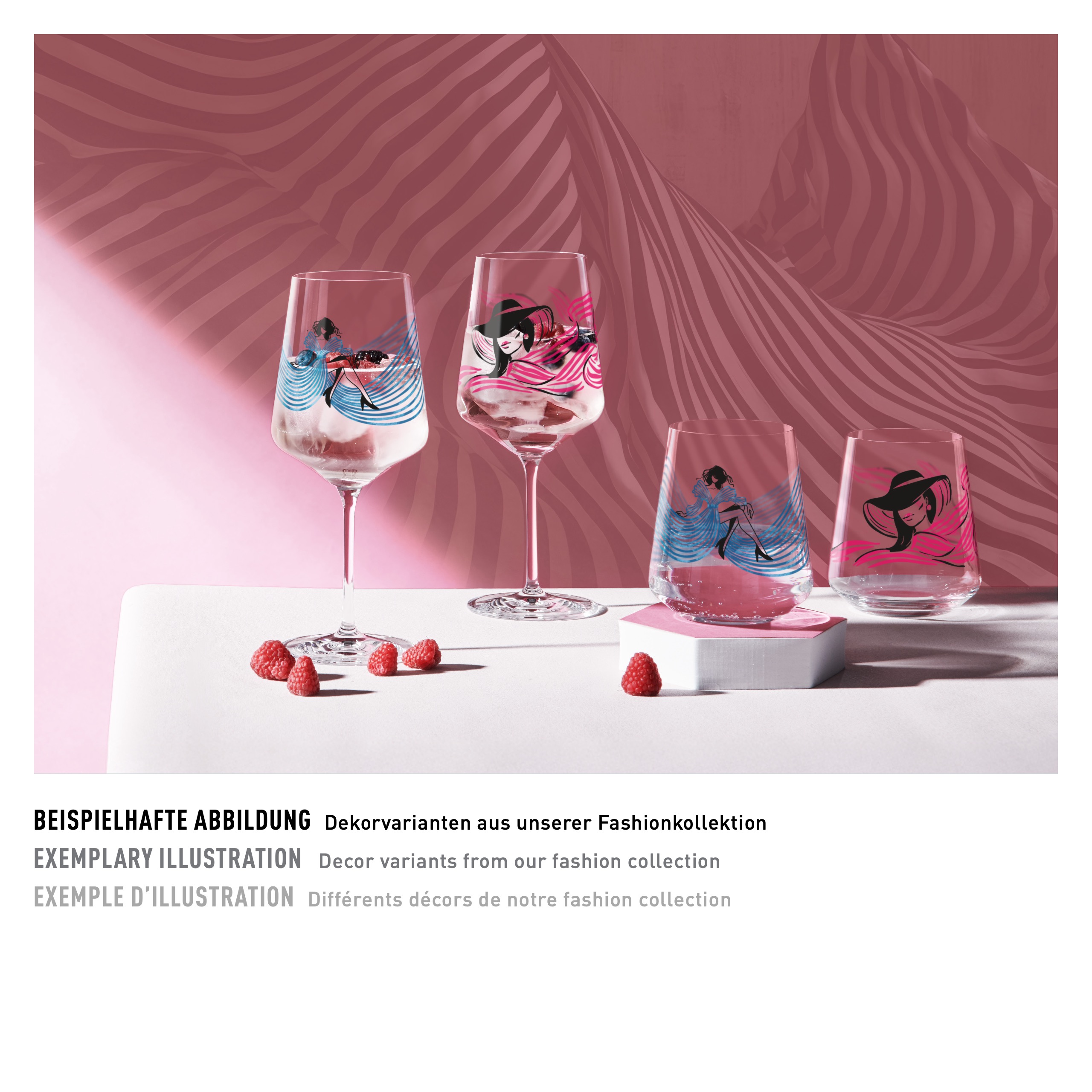 The slender glasses are adorned with seductive lipstick prints and dynamic strokes in pink, rose, and red – a design that radiates pure joie de vivre and a strong sense of style. Their shape promotes ideal aroma development and enhances the wine's freshness.