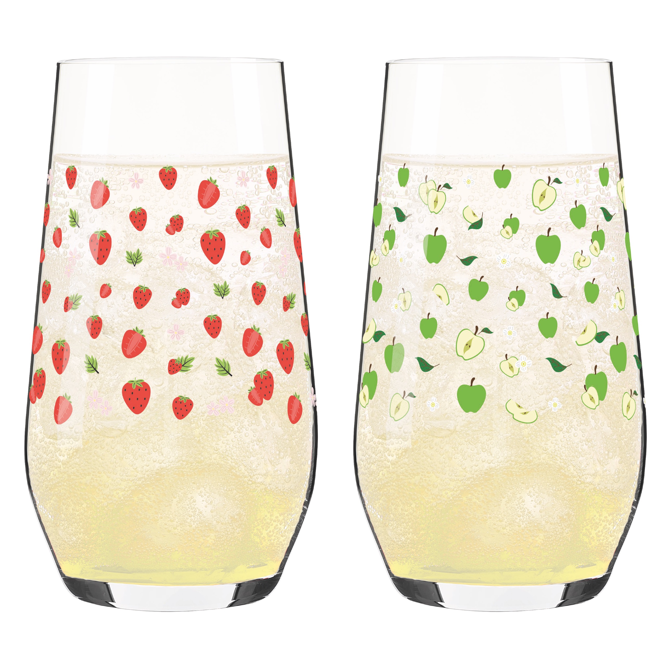 This glass set brings fruity delight to the table – with bright red strawberries and crisp apple pieces arranged in a playful composition. Every sip evokes a walk through blooming orchards.
