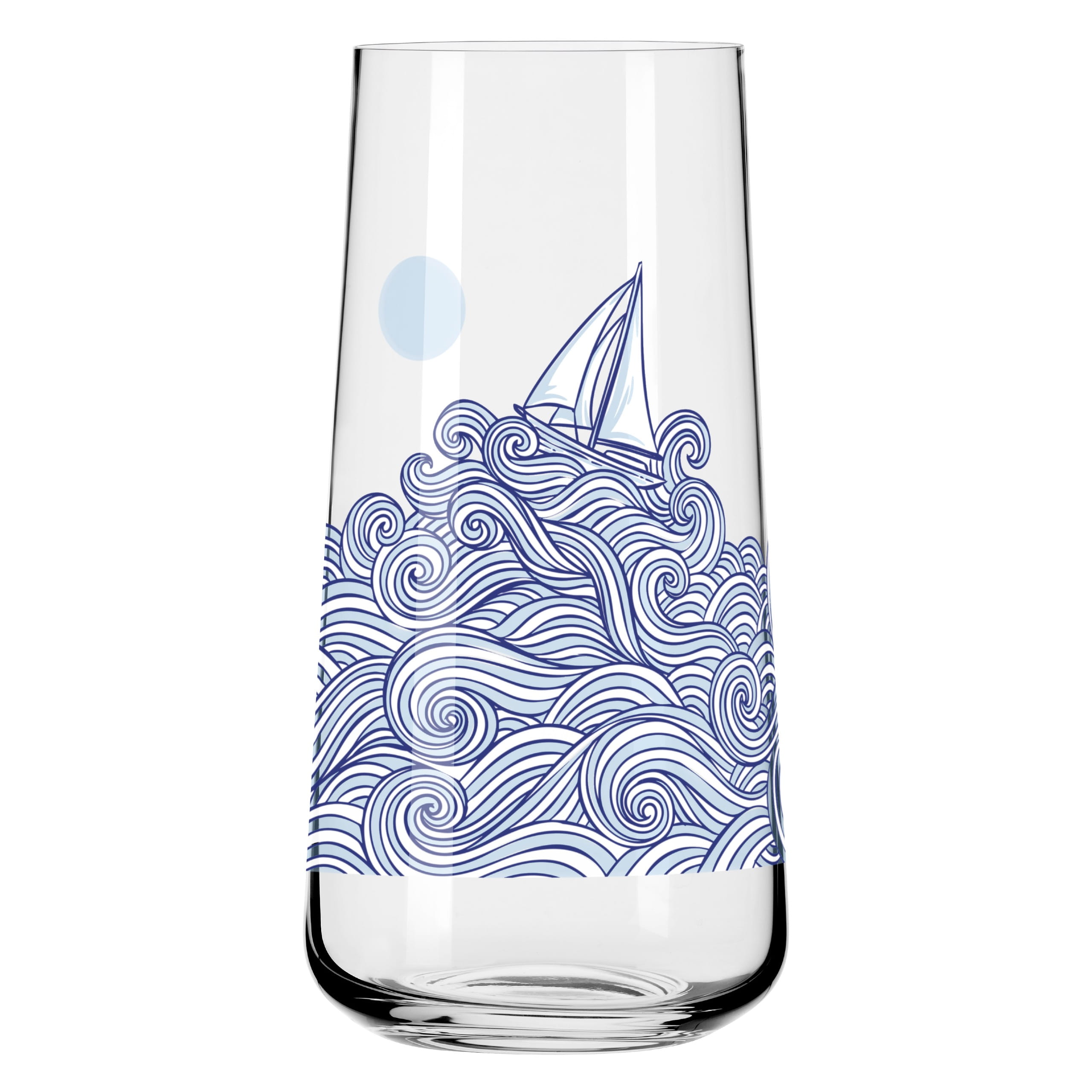 A glass full of motion: playful waves frame a small sailboat making its way across the sea. A design that conveys both tranquility and adventure.