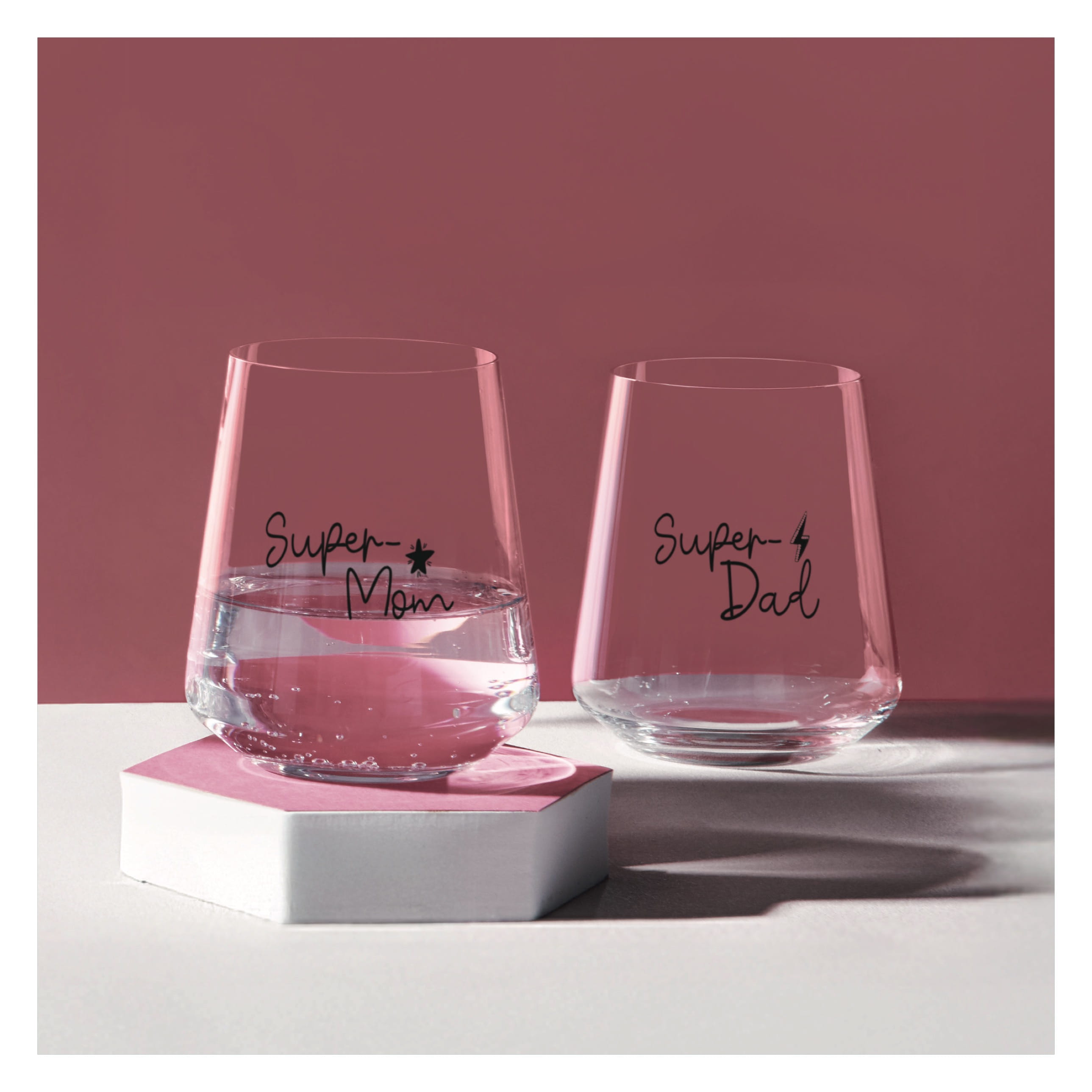 This glass set celebrates the true superheroes of everyday life – with a clean, modern typography that charmingly showcases “Super Mom” and “Super Dad”. The minimalist illustrations resemble little badges of honor, lending each drink a personal and heartfelt message. A design that doesn’t need to be loud to make an impact – simple, powerful, and full of appreciation for those who go above and beyond every single day.