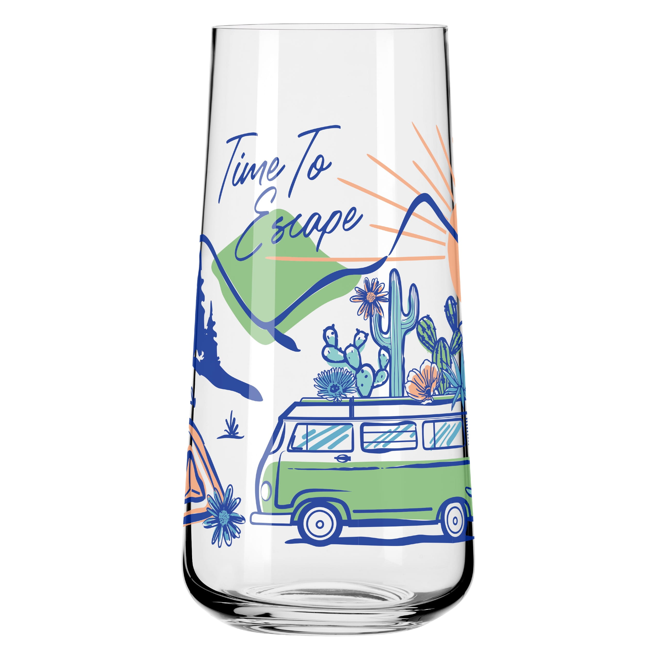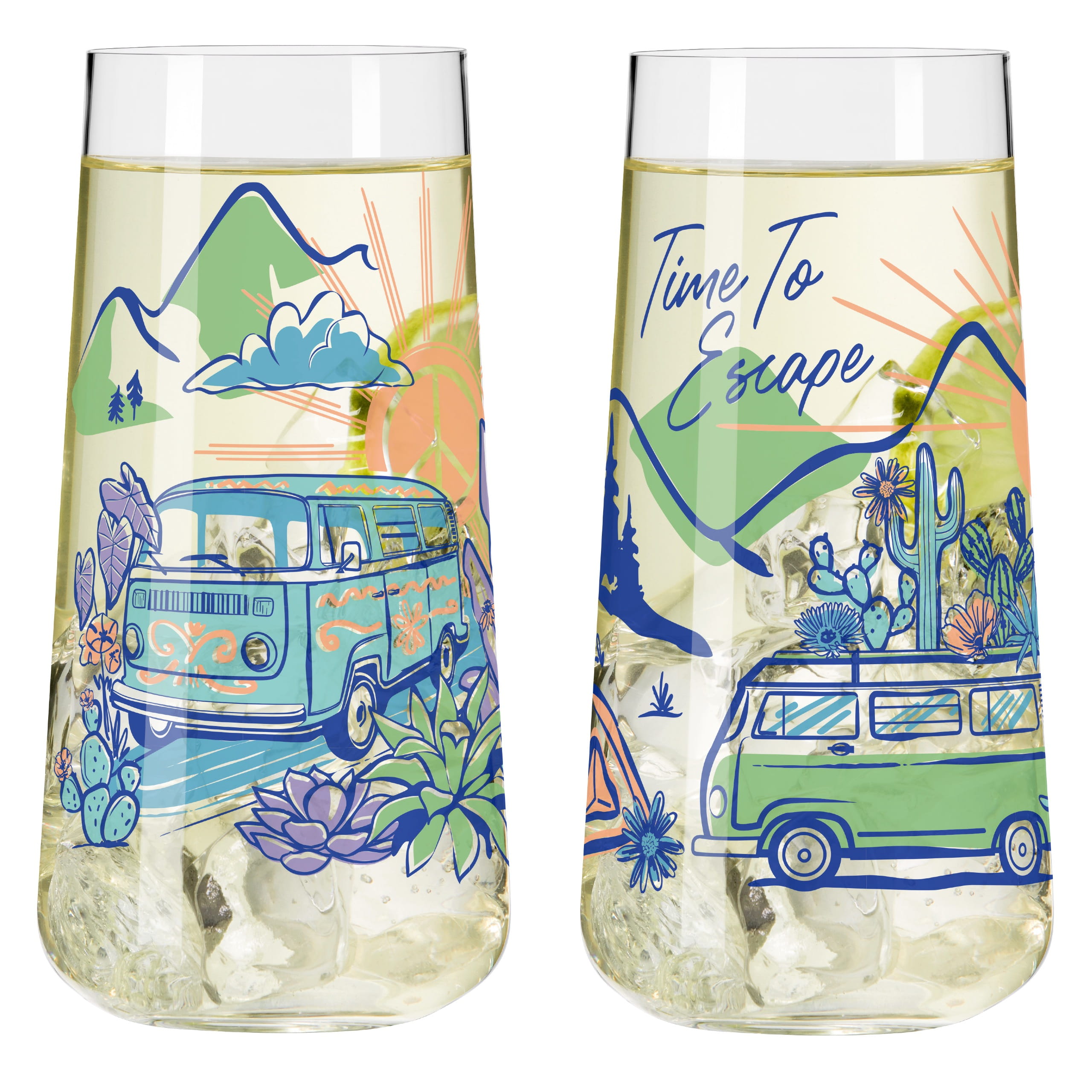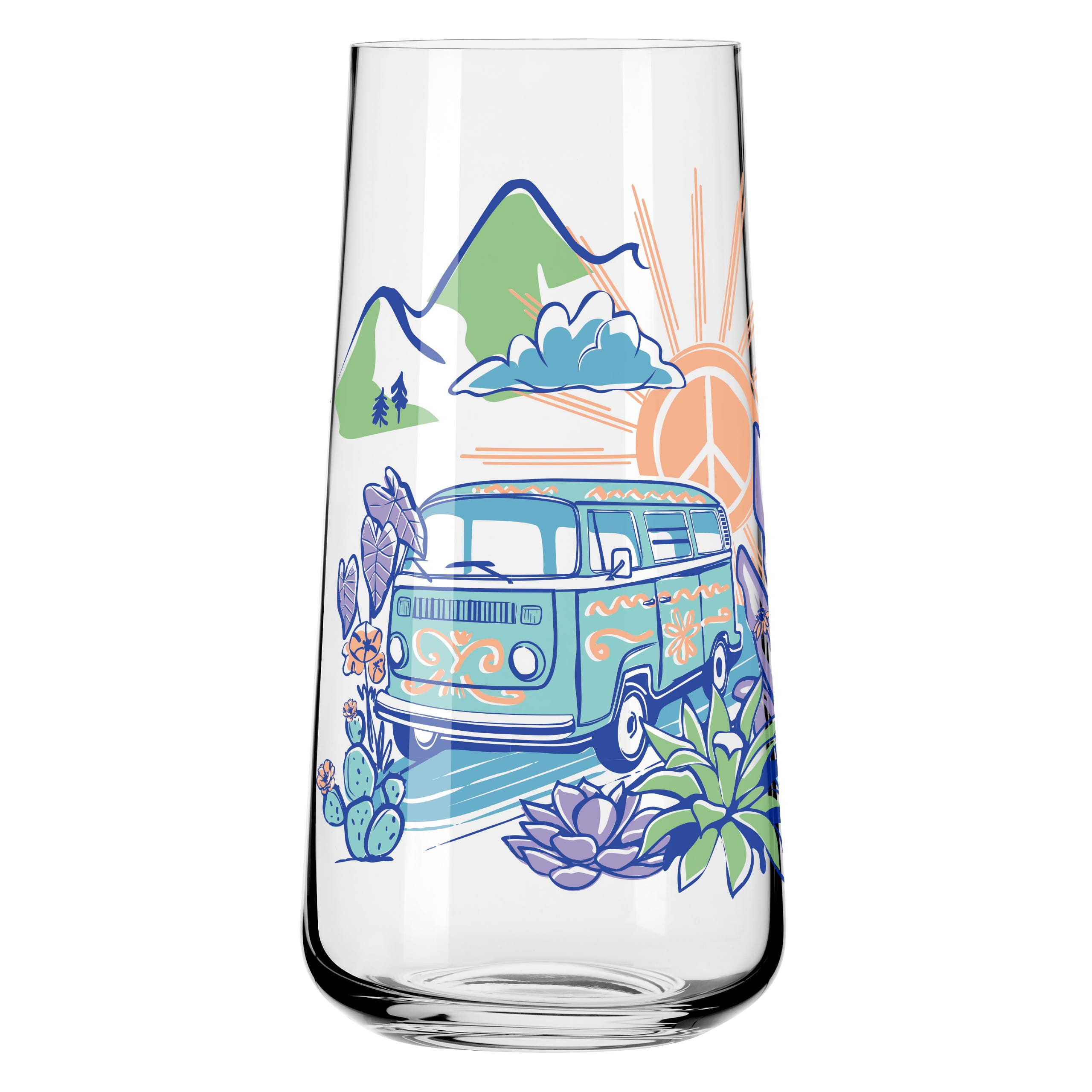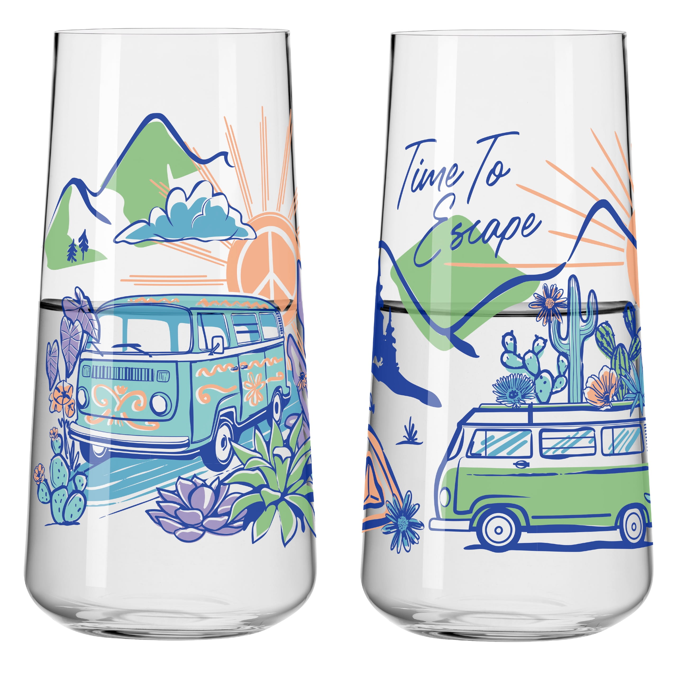 Ob Wasser, Limonade oder frisch gepresster Saft ‐ dieses Allroundglas‐Set ist der perfekte Begleiter für deinen Alltag und bringt gleichzeitig das Freiheitsgefühl des Vanlife in dein Zuhause. Die Motive, inspiriert von Camping und Bergen, lassen dich den Moment genießen, egal ob drinnen oder draußen