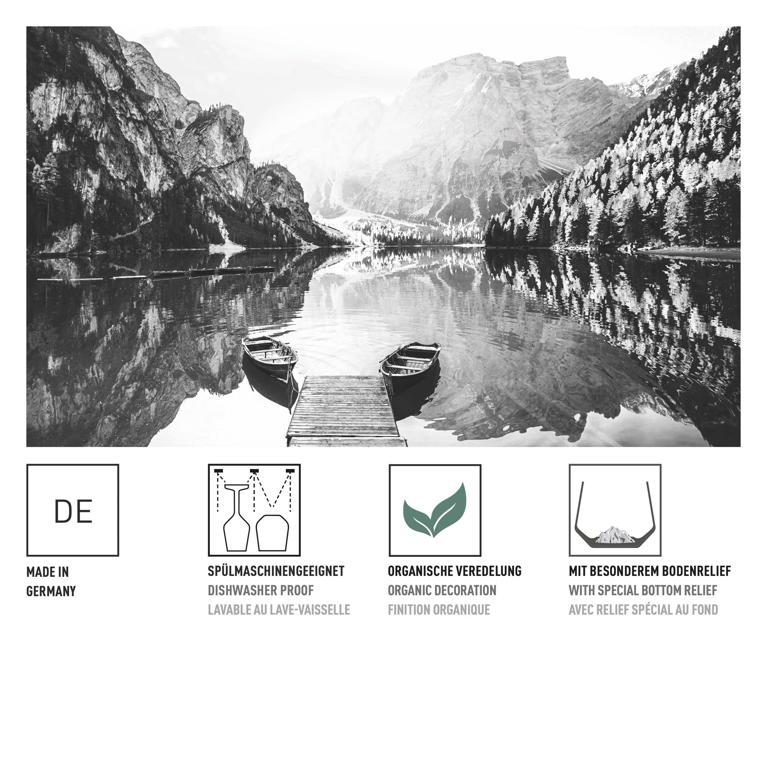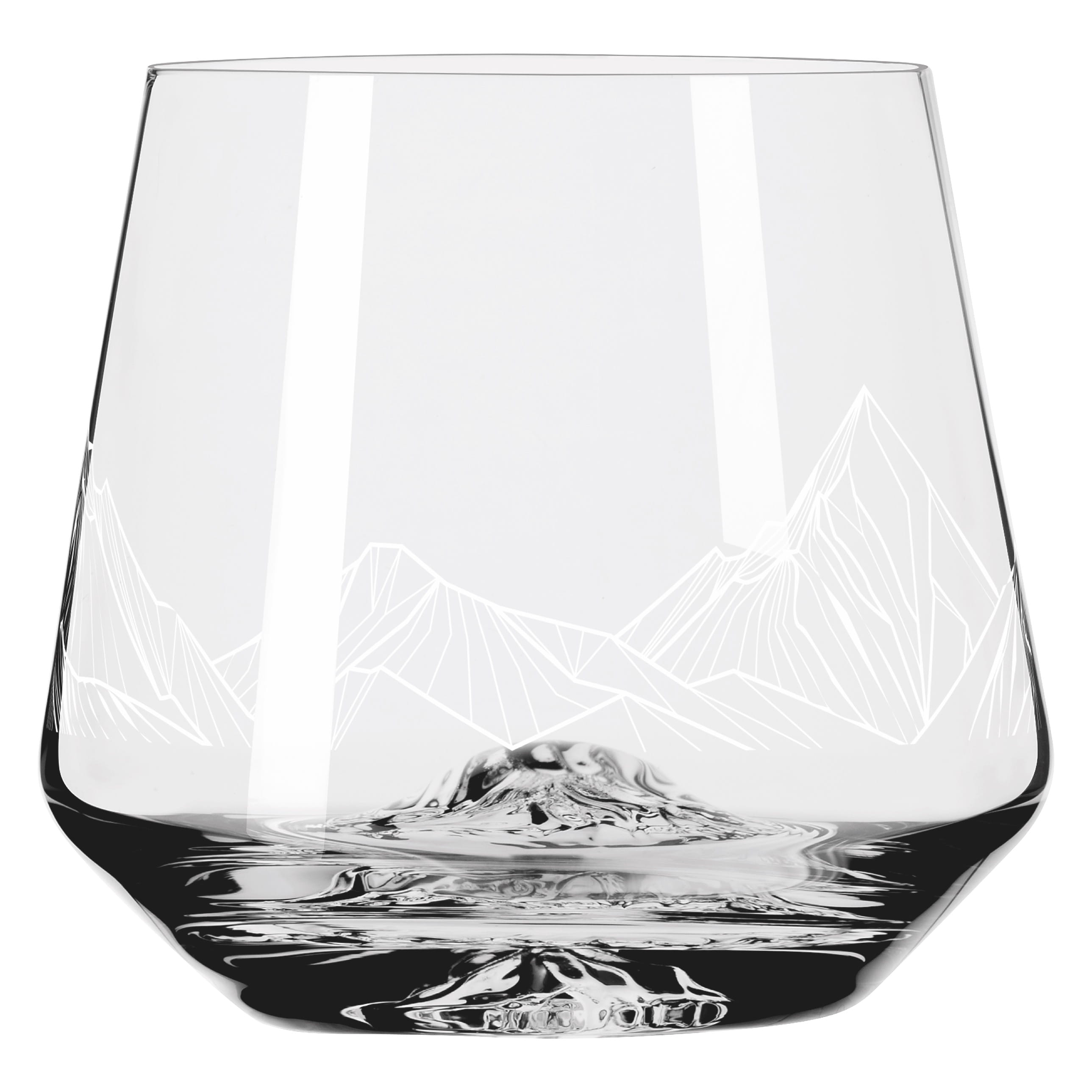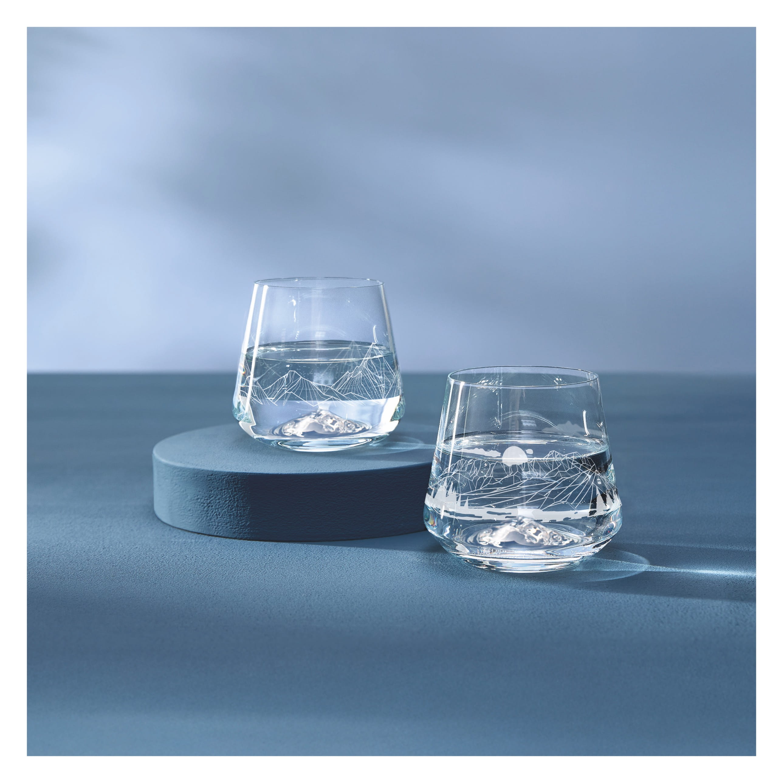 Ce verre éveille l'envie d'aventure – avec un paysage de montagne stylisé, marqué par des lignes épurées et des surfaces apaisantes. Chaque gorgée rappelle une profonde bouffée d'air frais alpin et évoque des instants loin du quotidien.