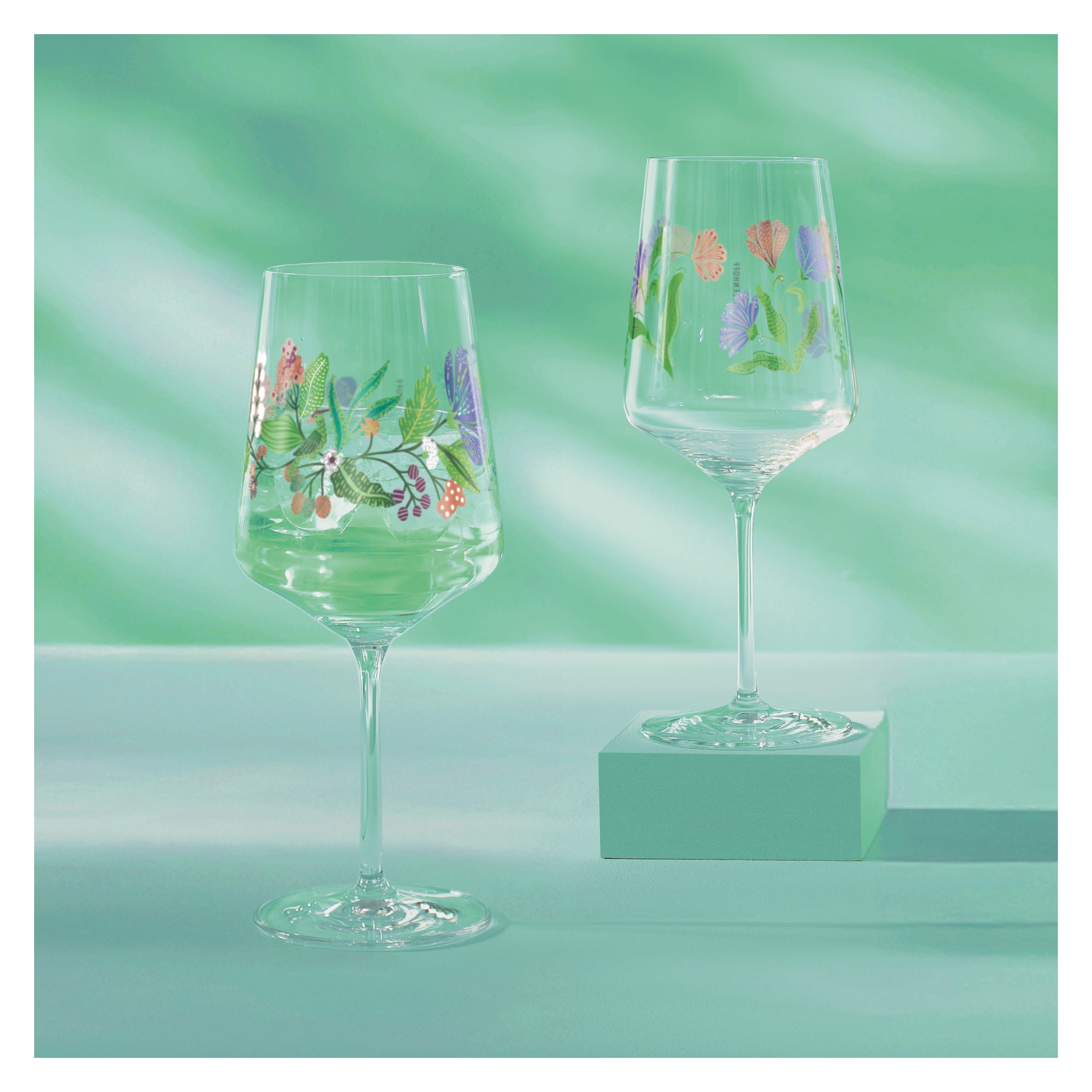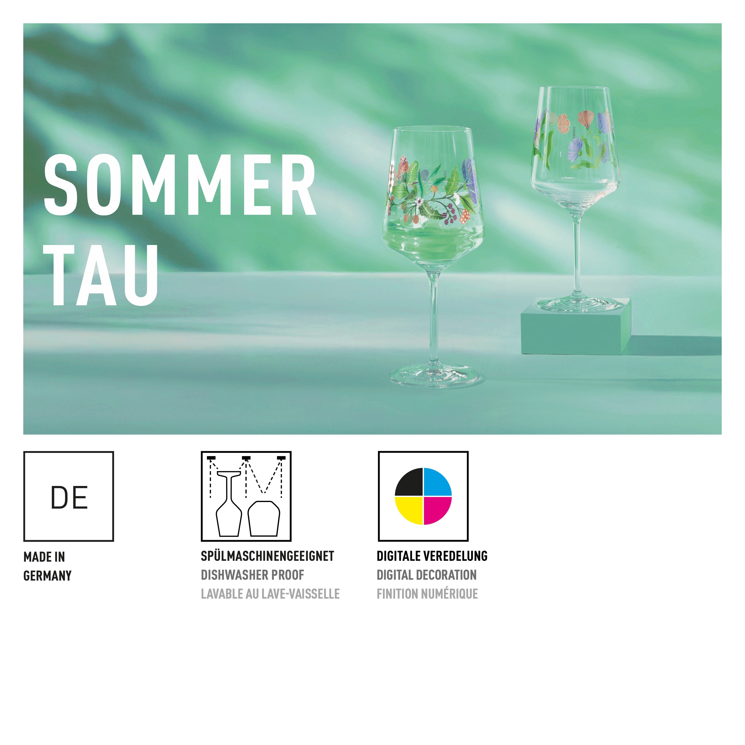 Des fleurs délicates, des tons de vert frais et de doux accents pastels évoquent un matin d'été paisible et confèrent à chaque boisson une touche naturelle et légère. Un ensemble qui allie élégamment légèreté et plaisir.