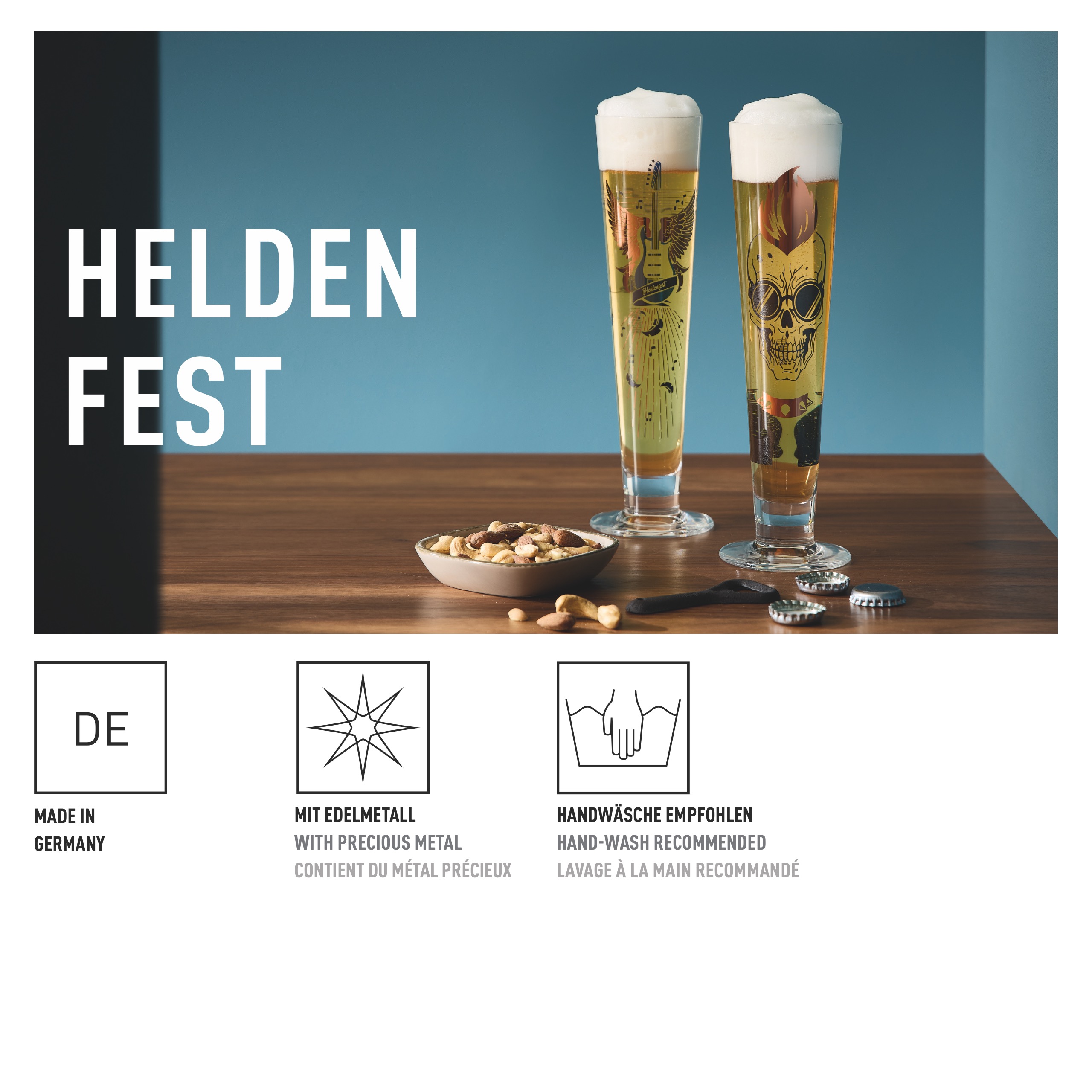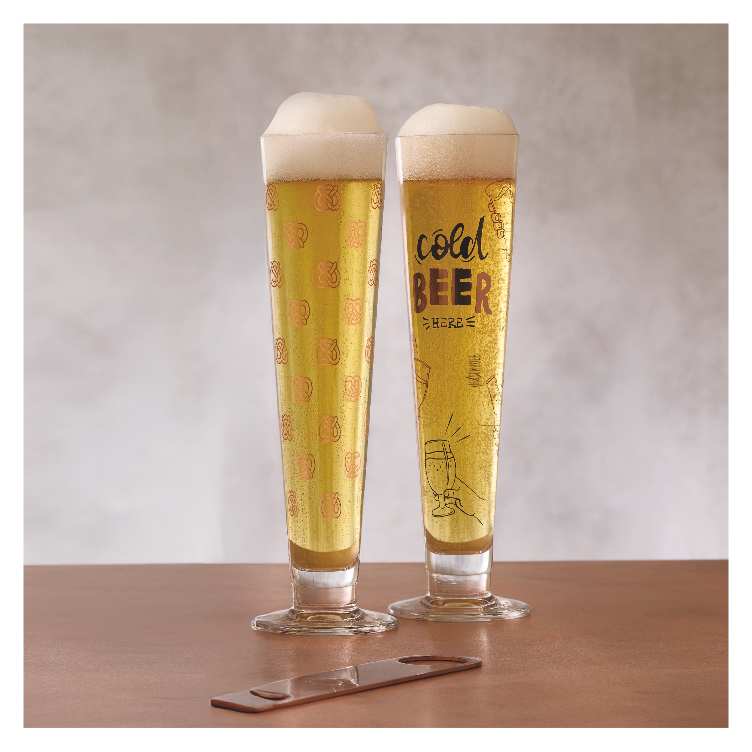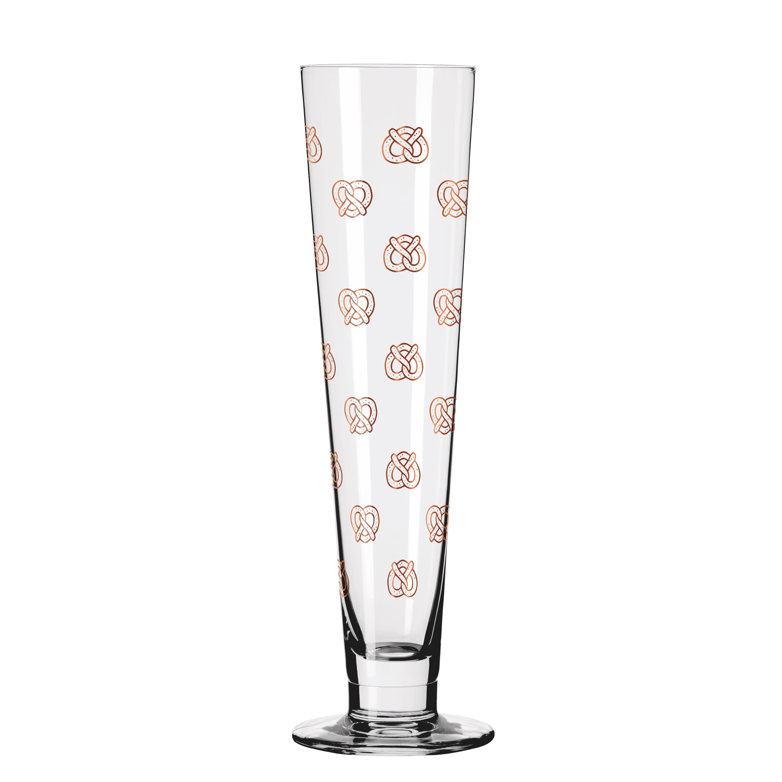Das gleichmäßig angeordnete Symbolmuster in warmem Kupfer verleiht dem Glas eine ruhige, fast meditative Wirkung. Die kleinen Brezeln stehen für Gemeinschaft, Beständigkeit und den Genuss im Moment.