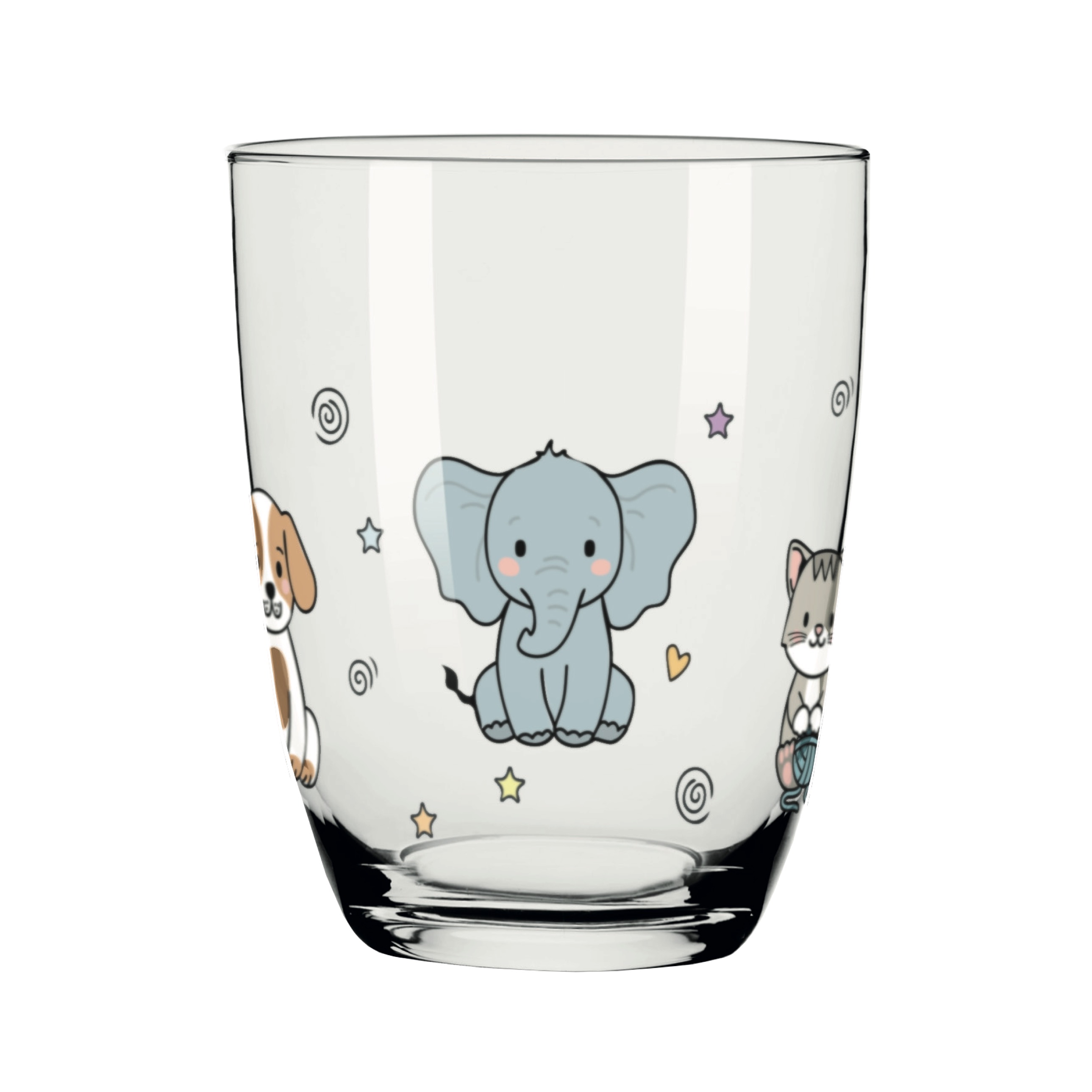 Niedliche Tierfreunde sorgen für gute Laune: Hase, Hund, Elefant, Katze und Bär begleiten dieses Glas mit verspieltem Charme. Zarte Farben und kleine Details machen das Design besonders freundlich und kindgerecht.