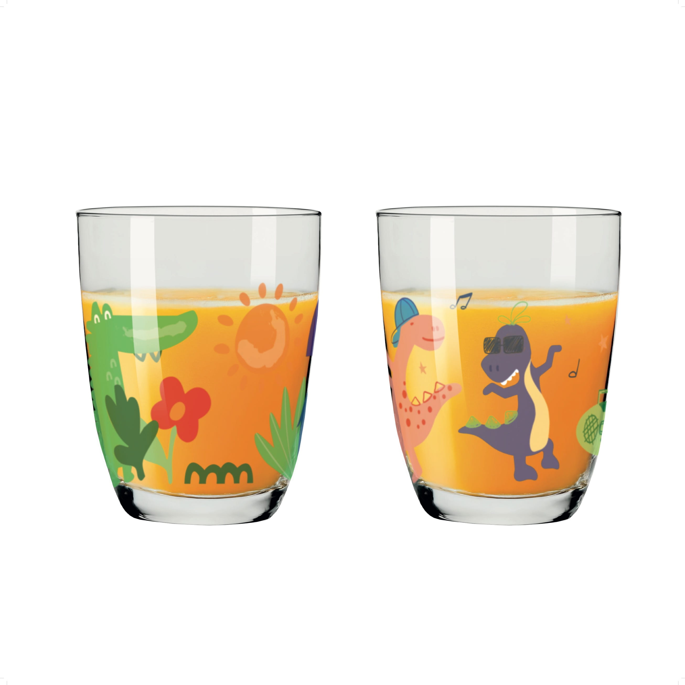 Das liebevoll gestaltete Set bringt gleich zwei Welten auf den Tisch: Auf einem Glas stapfen charmante Dinosaurier durch ihre bunte Urzeitlandschaft, während auf dem anderen ein gut gelauntes Trio aus Krokodil, Elefant und Giraffe für strahlende Kinderaugen sorgt.