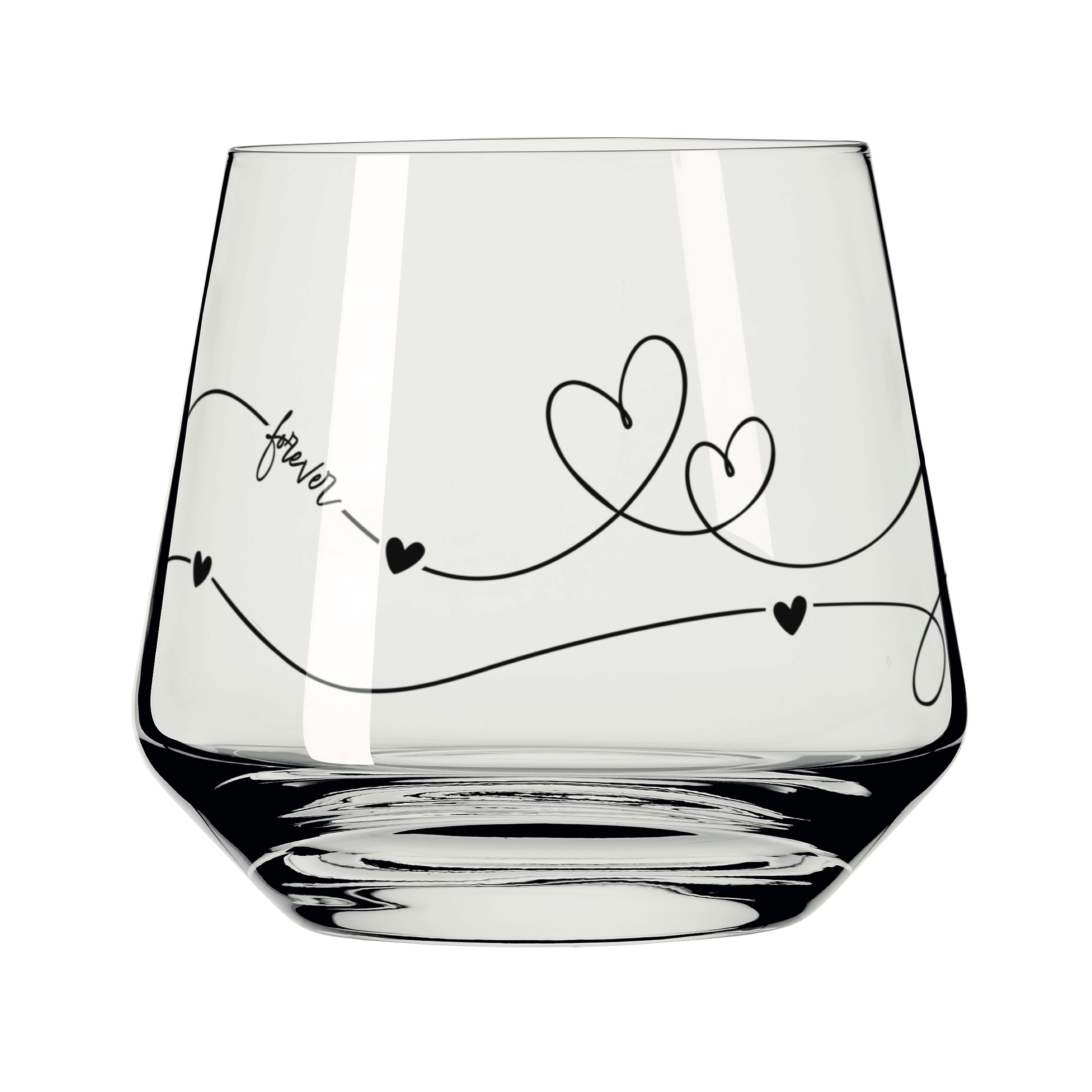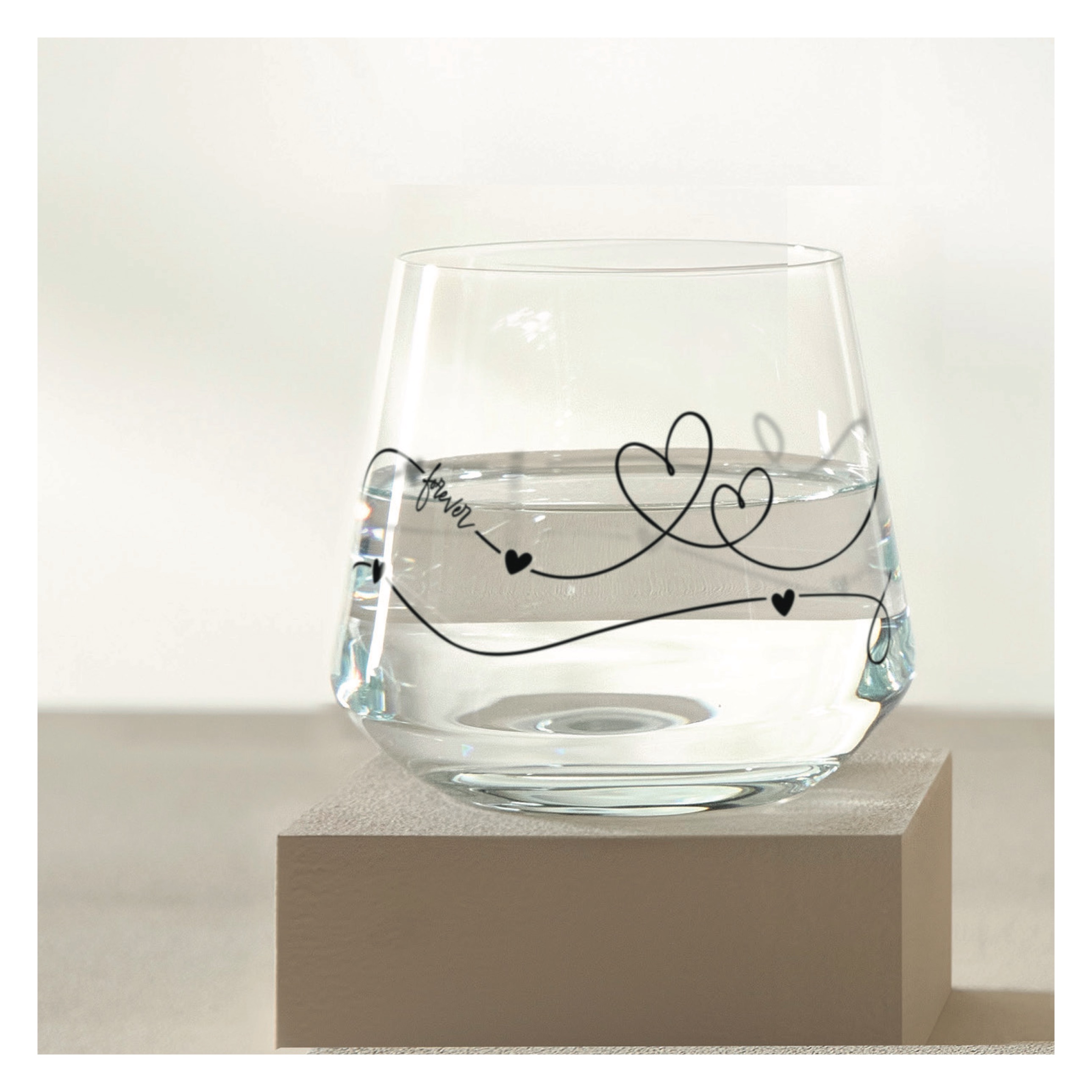 Zarte Linien, kleine Herzen und das Wort „forever“ umspielen dieses elegante Glas und machen es zu einer liebevollen Botschaft. Das filigrane Dekor steht für Verbundenheit und zeitlose Romantik – perfekt für besondere Momente, zum Verschenken oder zum täglichen Genießen.