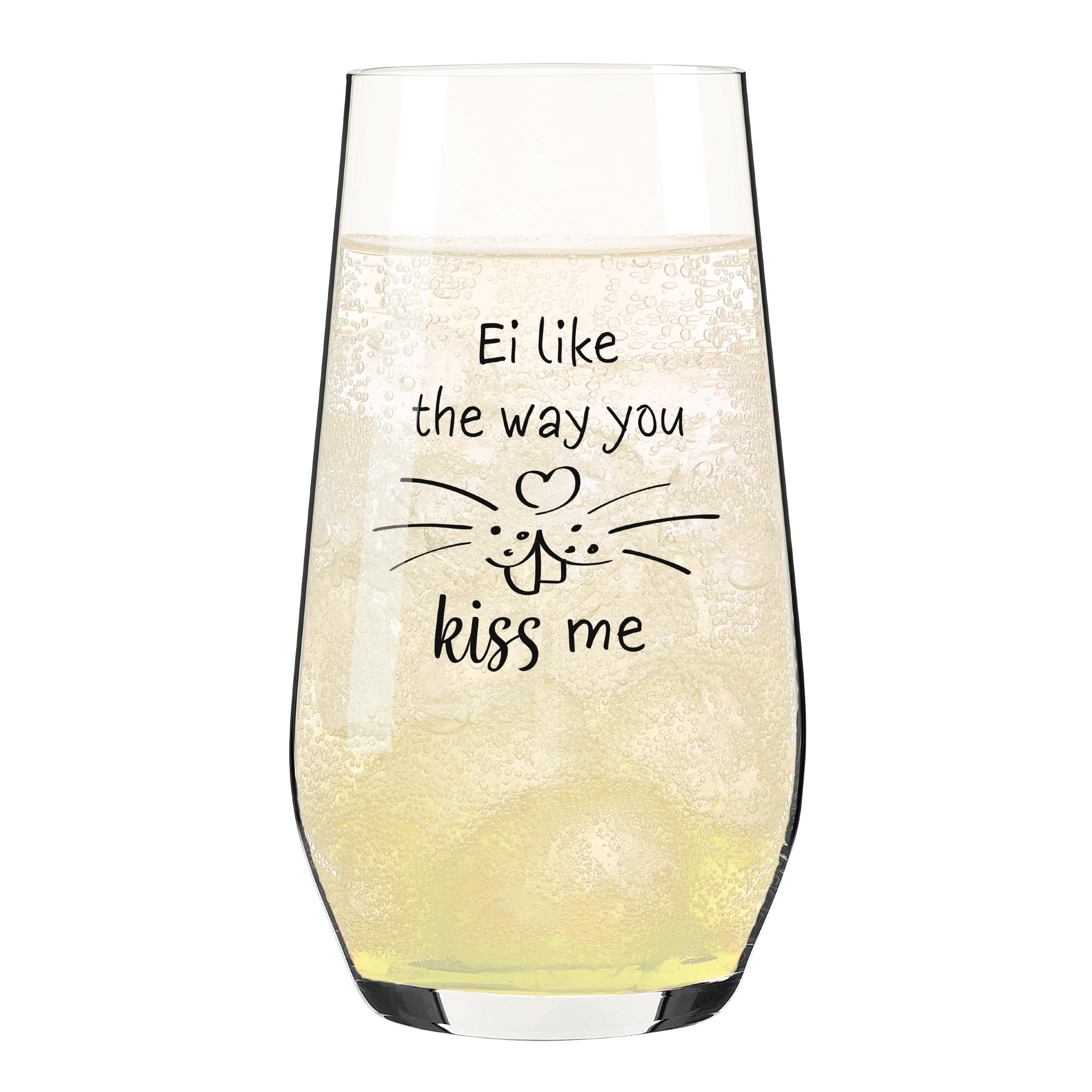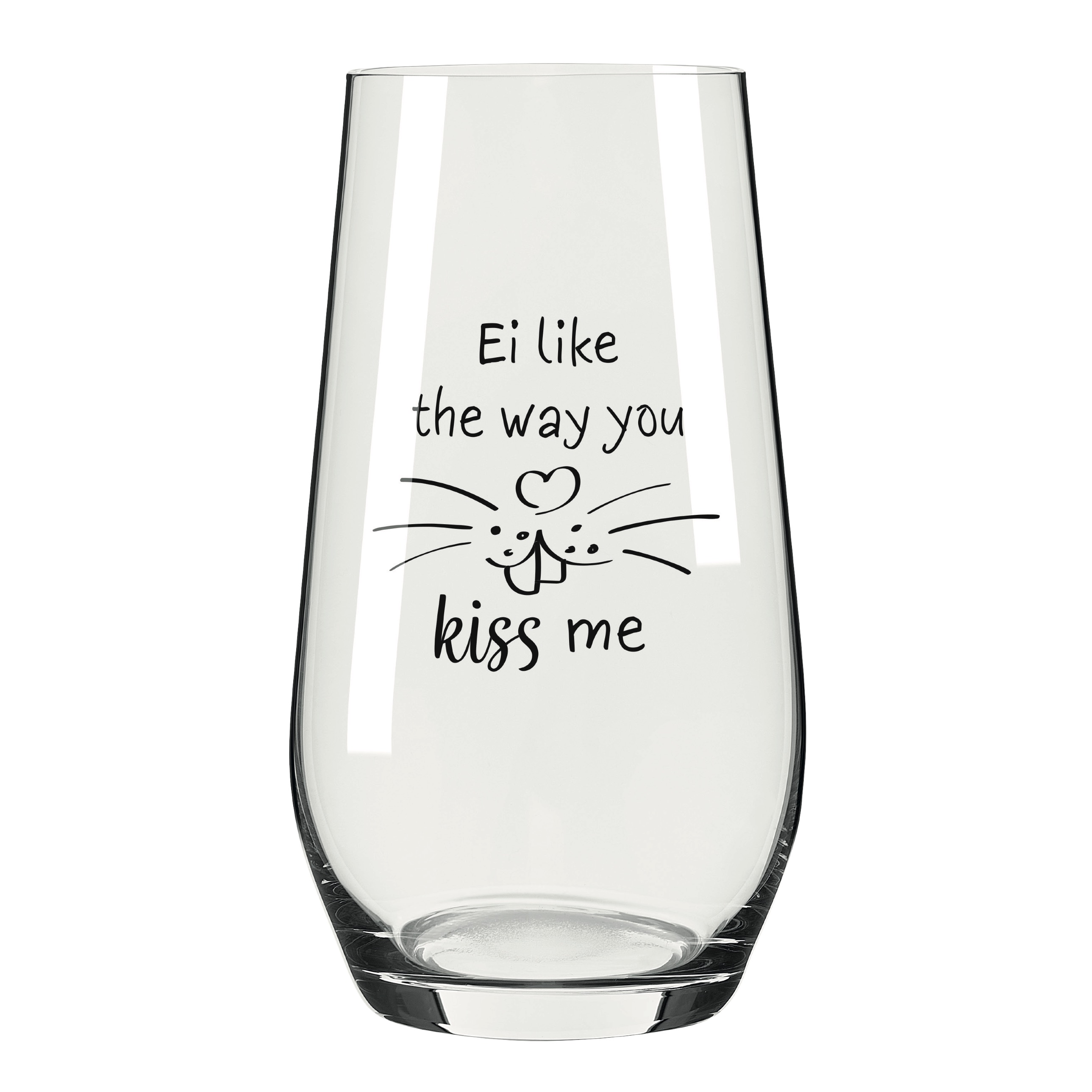 Mit liebevoller Botschaft und feinem Humor setzt dieses Design ein charmantes Statement. Der verspielte Schriftzug ‚I like the way you kiss me‘ wird durch zarte Details ergänzt und verleiht dem Glas eine romantische, zugleich moderne Note.