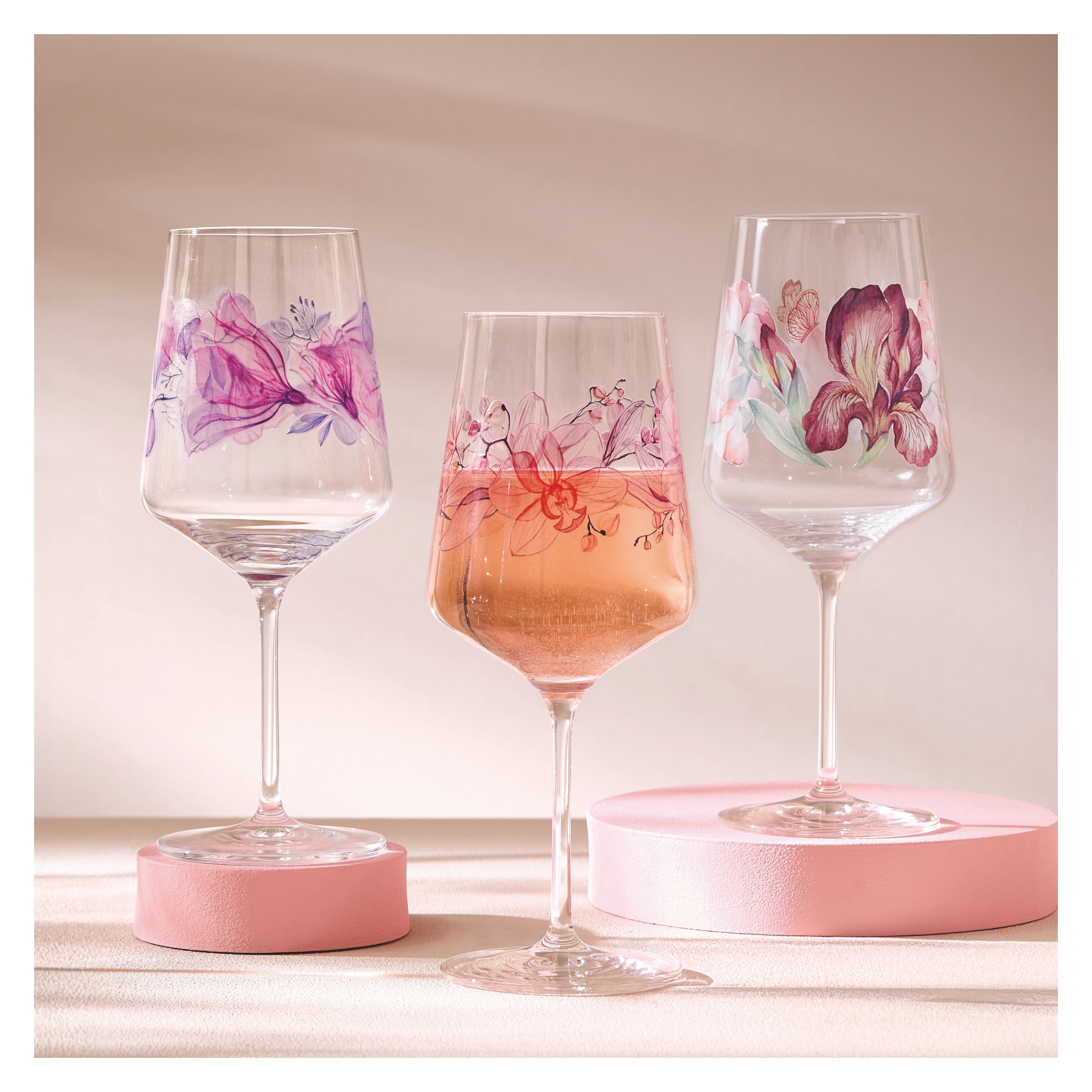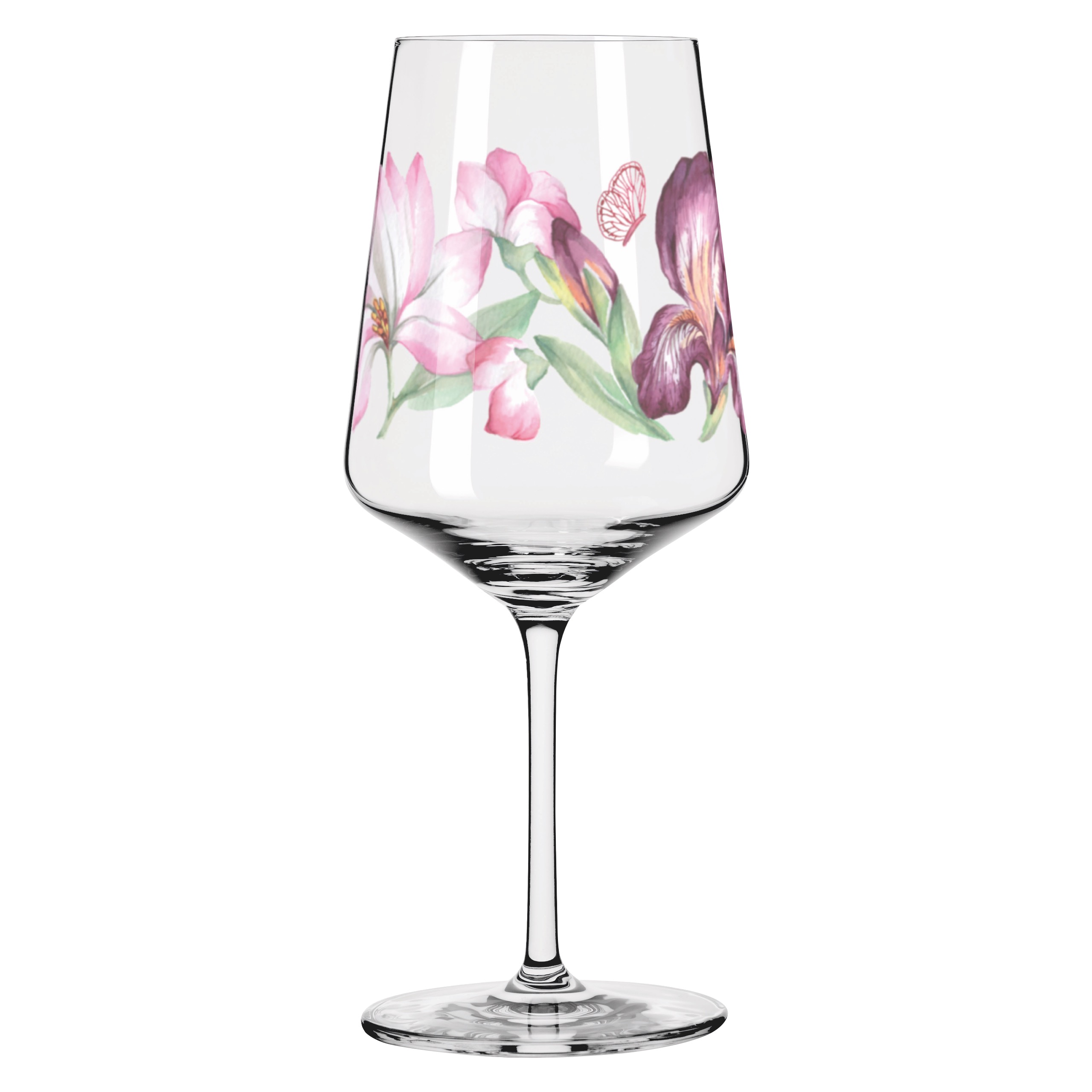 Dieses Glas verzaubert mit einem zarten Blumenmotiv, das an einen blühenden Sommertag erinnert. Fein illustrierte Blüten und filigrane Schmetterlinge entfalten sich harmonisch um den Kelch und verleihen jedem Drink eine leichte, elegante Note.
