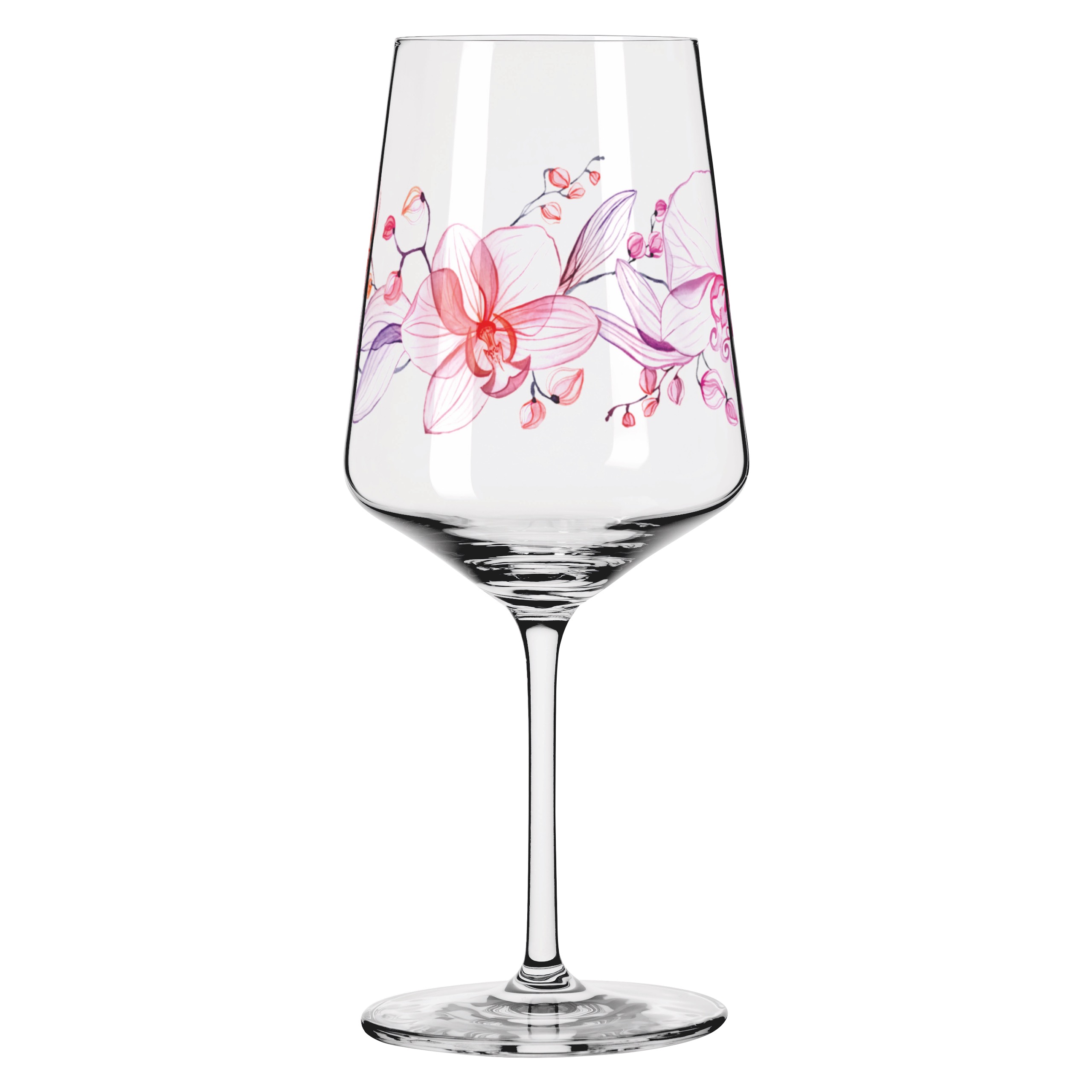 Ein florales Dekor aus fein illustrierten Blüten entfaltet sich leicht und elegant rund um den Kelch. Sanfte Farbnuancen und klare Linien schaffen eine moderne, sommerliche Ausstrahlung, die jeden Drink optisch veredelt.