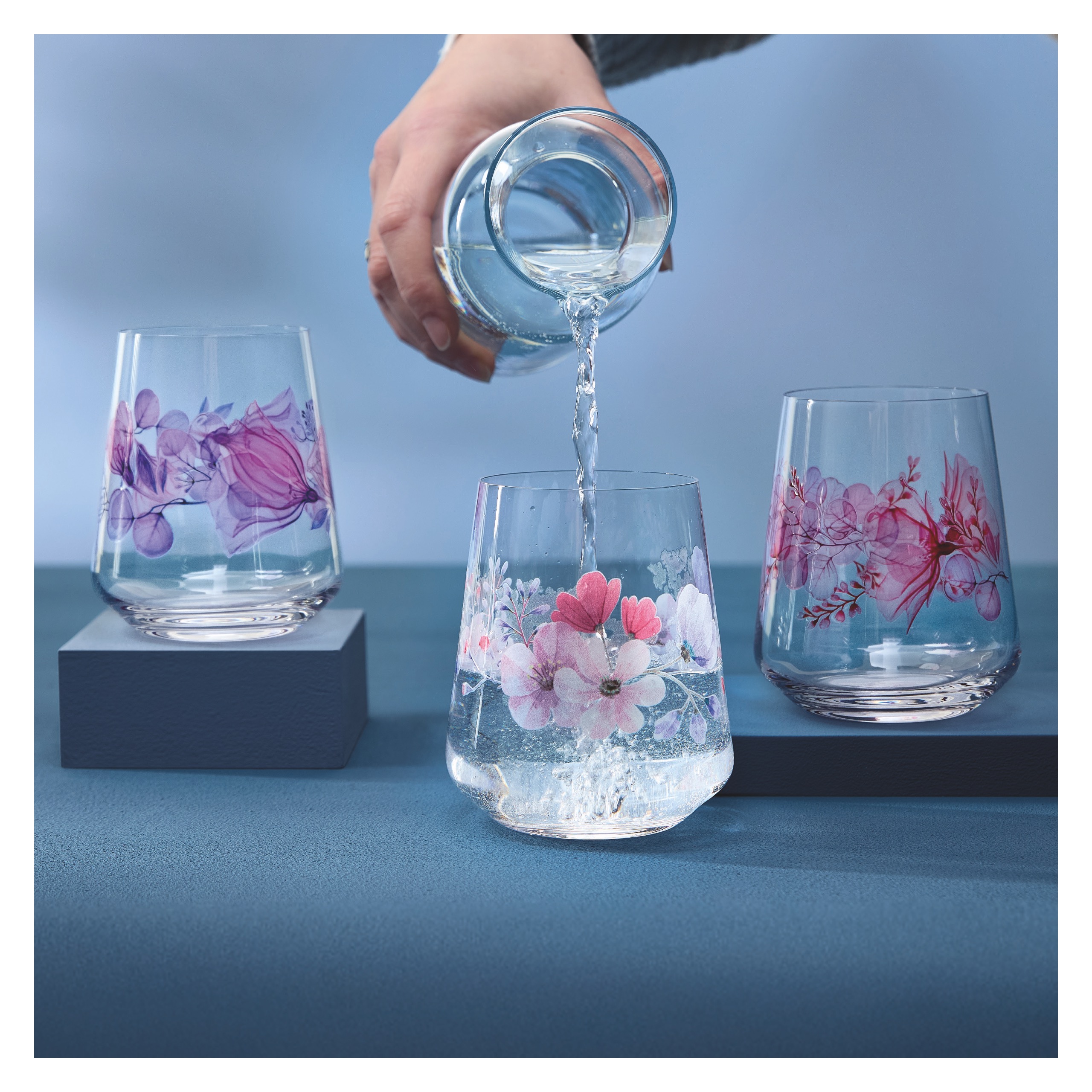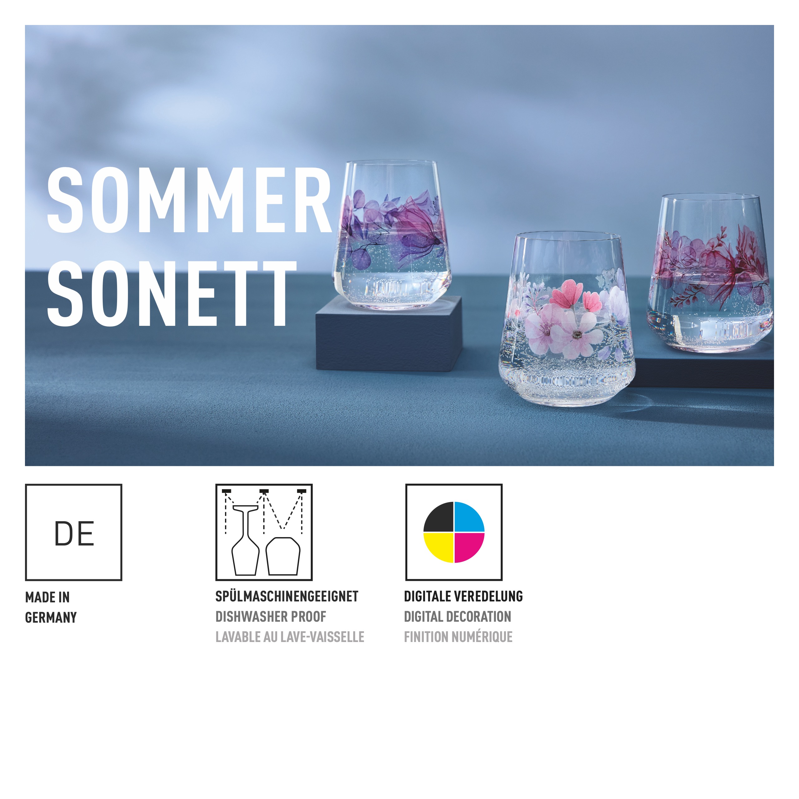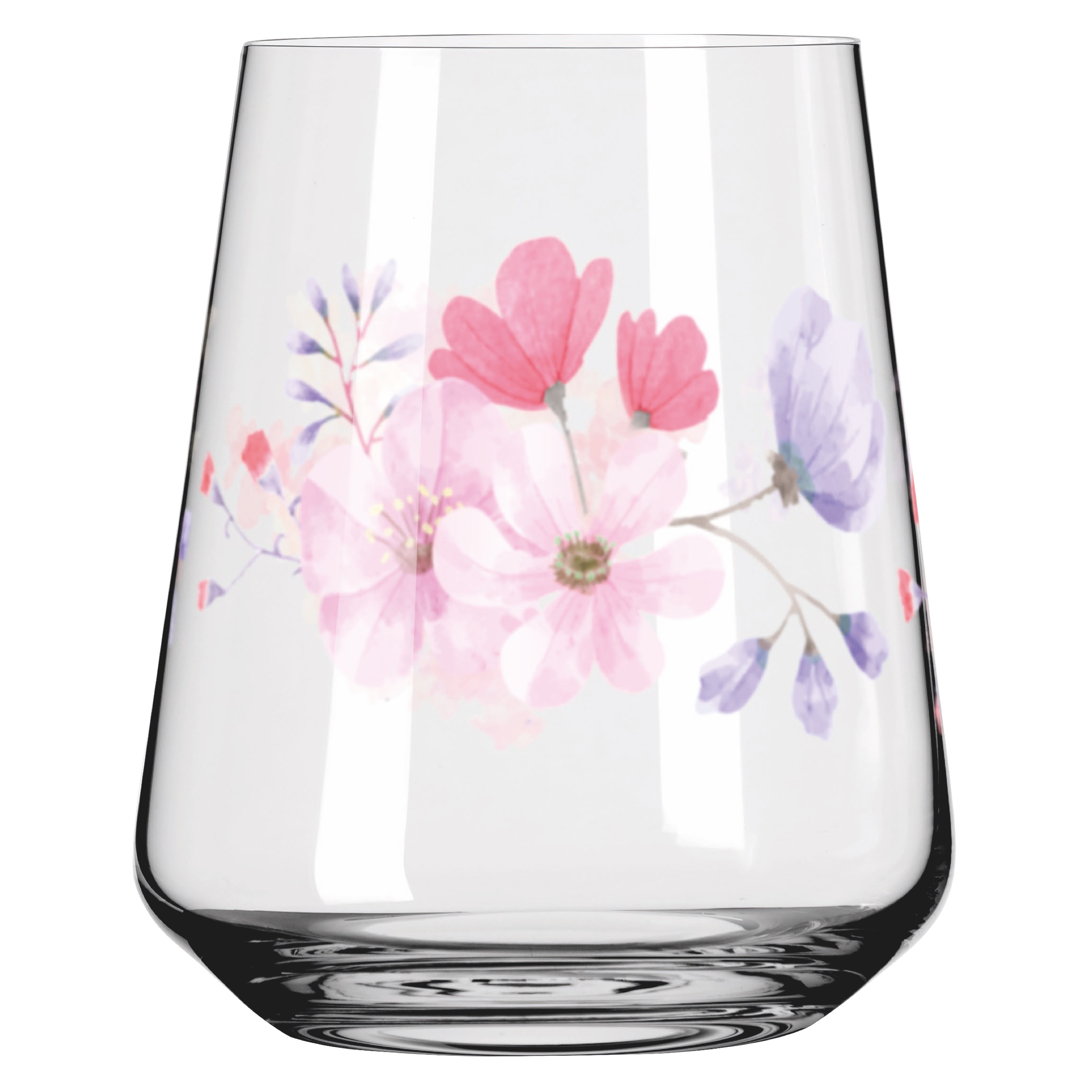 Zarte Blütenmotive entfalten sich auf dem Glas und verleihen dem Design eine leichte, poetische Wirkung. Die feinen Farbverläufe wirken ruhig und modern zugleich und machen jeden Drink zu einem sanften Genussmoment voller Leichtigkeit und Sommergefühl.