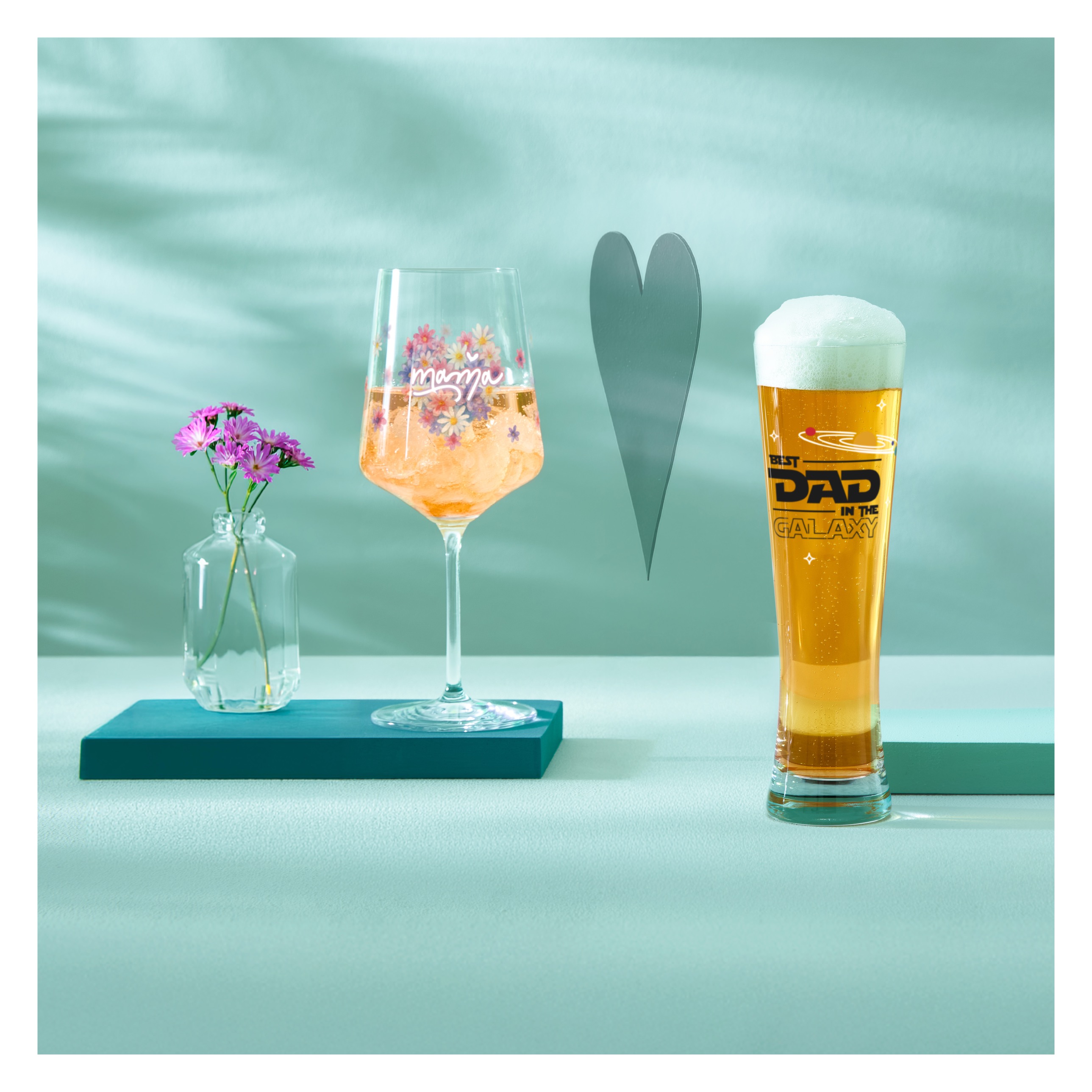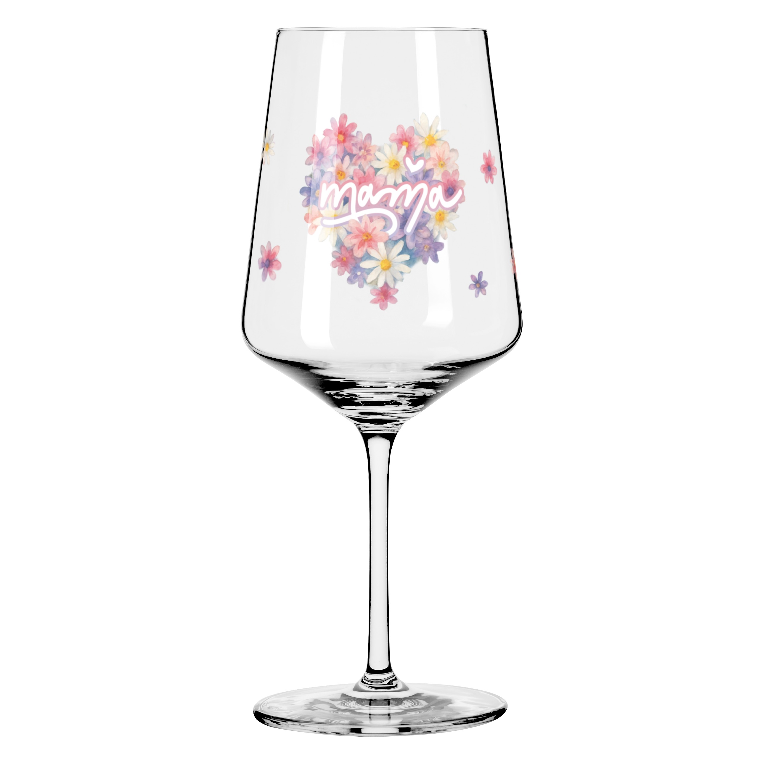 Zarte Blüten formen ein liebevolles Herz und setzen den Schriftzug ‚mama‘ stilvoll in Szene. Die harmonische Farbwelt und das florale Design verleihen dem Glas eine warme, persönliche Note – ein besonderes Zeichen der Wertschätzung für einen ganz besonderen Menschen.